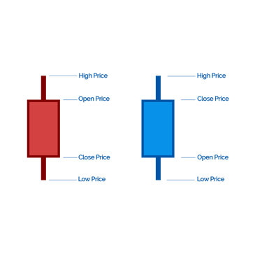 A candlestick chart displays the market’s open, high, low, and close prices within a given time period. Each individual "candlestick" represents one period - whether that's a minute, hour, day, or week - depending on the timeframe selected.