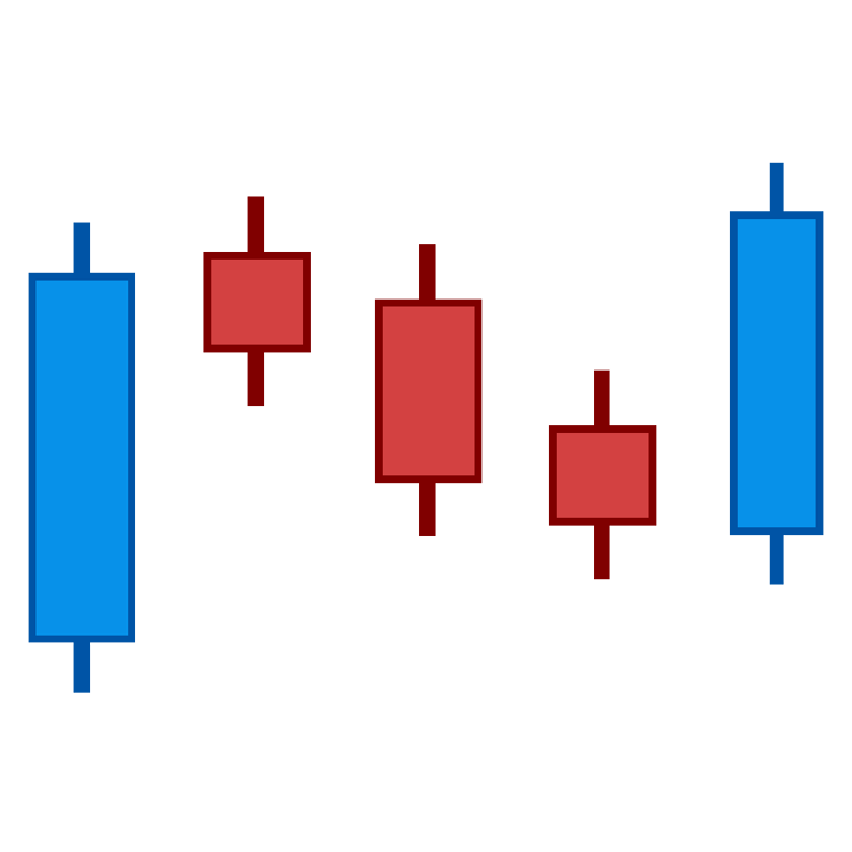 The Bearish Falling Three is the opposite of the Bullish Rising Three. It begins with a large bearish candle, followed by three small bullish candles that remain within the range of the initial down move, and finishes with another large bearish candle. This pattern suggests that the bears are regaining control, and further downside movement is likely.