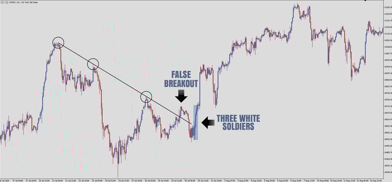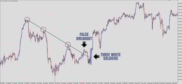 The chart below provides a great example of how to use trendlines and candlestick patterns to identify accurate entry points. Upon trendline breakout, a three white soldiers pattern formed, which suggested that the price was likely to continue the upward trajectory.
