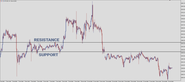 In the exemplary price chart above, a resistance level and a support level are illustrated. The support level is an area where buyers are likely to step in and prevent price from falling further. Resistance levels are areas where sellers are likely to step in and prevent the price from rising further.