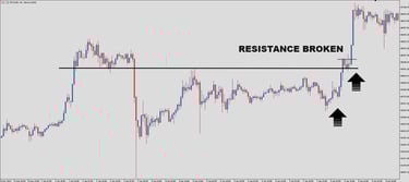 Once the key levels are identified, watch for a breakout. Breakouts are formed when price action breaks through support or breaks through resistance. For example, note the bullish breakout illustrated below.
