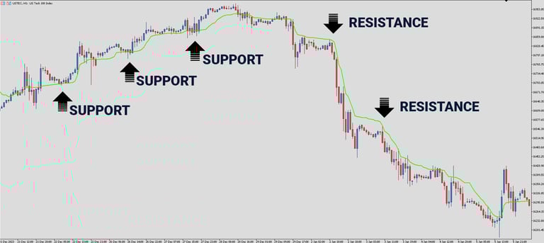 Support and resistance areas can be identified on charts using trendlines and moving averages.